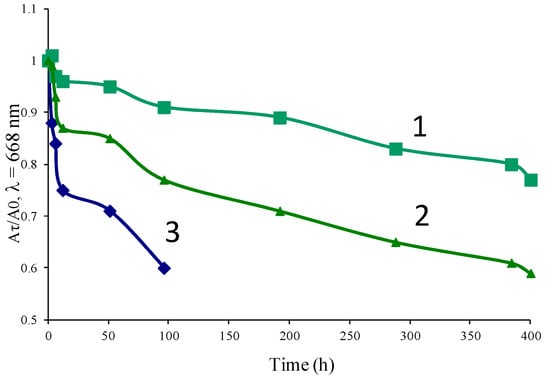 Figure 2 describes the changes in optical density at a wavelength of 668 nm, corresponding to the maximum of the absorption spectrum of Reactive Blue 38. As can be seen in Figure 2, the kinetic curves have a complex shape—a fast initial section is followed by a slower stage. The criterion of stability in this case is a decrease in optical density by 40%, corresponding to a pronounced change in the colour of the composition; therefore, further continuation of irradiation is of no practical importance.