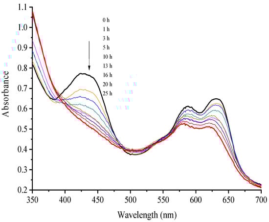 Variation in the near-UV and visible absorption spectra of PMMA films coloured by MMCS-2-based NPs with Disperse Blue 56 and Disperse Yellow 13 with the duration of photolysis, as determined by Suntest. The NP content in the film was 1.04 wt%, and the loadings of Disperse Blue 56 and Disperse Yellow 13 in the mixture were 16.1 wt%. The film thickness was 400 μm. The numbers in the figure next to the arrow indicate the irradiation time, hours.