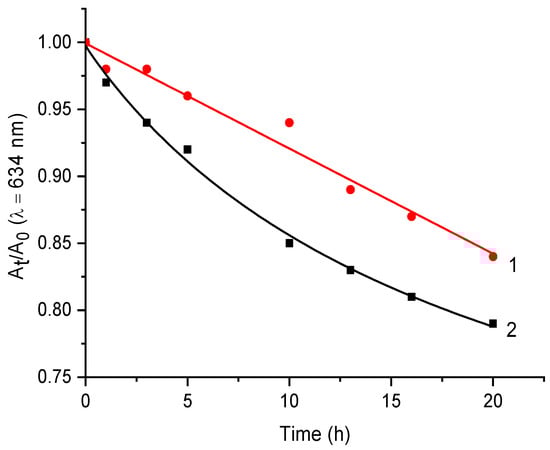 Kinetic curves of the photodegradation of Disperse Blue 56 in PMMA films coloured by MMCS-2-based NPs with Disperse Blue 56 (17.5 wt%) only (1) or a mixture of Disperse Blue 56 and Disperse Yellow 13 (16.1 wt%) during irradiation in Suntest. The NP contents in the film were 2.45 wt% (1) and 3.1 wt% (2), and the film thickness was 300 μm. The measured parameter was the optical density at a wavelength of 634 nm, corresponding to the maximum absorption of Disperse Blue 56, as determined experimentally by the UV–Vis absorption spectrum of a PS film containing NPs with Reactive Blue 56 only.