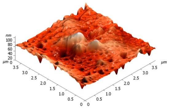 Similar to the case with NPs based on individual dyes [], the advantages of UV inks with NPs based on dye mixtures are likely the result of their nano-sized structure. One important source of support for this hypothesis is provided by the AFM data (Figure 5), which indicate the absence of structures higher than 100 nm and wider than 500 nm at the base from the film surface produced by curing UV inks with NPs based on a mixture of Acid Violet 49 and Disperse Blue 56 dyes. As mentioned above [], inks with NPs are fundamentally different from UV inks based on common pigments. In the latter case, the surface has heterogeneities with typical sizes of 0.8–1.2 μm in height and 1–2 μm in width at the base.