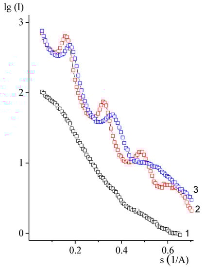 A more in-depth study of the films by small-angle X-ray diffraction analysis, however, indicates that some of the NP nanoparticles are present in the form of aggregates (packs), each comprising several tens of MMCS plates with applied dyes (Figure 6). The presence of clearly expressed basal reflexes, which are absent in similar films without NPs and in films with a common pigment, proves the presence of regulation zones provided by the formation of MMCS plate aggregates (30 nm thick) with a characteristic distance between layers (plates) of 3.5 nm. These assessments correlate well with the data obtained for analogous samples containing MMCS in the absence of a dye (i.e., an aggregate thickness of ~35 and an interlayer distance of 3.9 nm). Because the interlayer distance in these aggregates exceeds the MMCS interlayer distance (1.9 nm), the data obtained indicate intercalation of the oligomer/monomer binder to almost the same extent in both NPs and MMCS without the dye. These results are fully consistent with what is known about the structure of polymer mixtures with montmorillonite nanoparticles, in accordance with which both polymers intercalate into the interlayer space when mixed, and nanoparticles exfoliate []. The local microsurroundings of the dye molecules in such aggregates (i.e., oligomer/monomer binder and a surfactant fragment) do not significantly differ from their surroundings when they are located in individual MMCS particles. Consequently, the difference in spectral characteristics should not be significant.