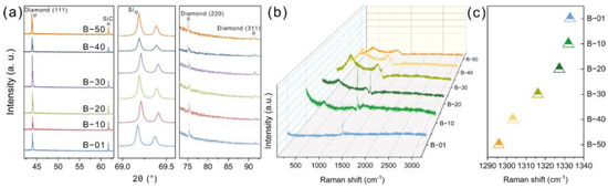 Raman spectroscopy was employed to investigate the changes in the boron doping concentration of the PBDD films. B−01 shows a characteristic peak of diamond at 1332 cm−1 (Figure 2b), and there are no broad peaks related to doped boron because of its low concentration. The Raman spectrum of the B−10 sample shows two weak peaks at 500 cm−1 and 1200 cm−1, which correspond to the boron doping-induced Fano effect and density of states [33]. The two broad peaks gradually become distinct from those of B−10 to B−50, whereas the sp3 peak weakens. This is because an increase in the boron doping concentration can lead to a decrease in the intensity of sp3 peaks [34]. For both B−40 and B−50, the diamond sp3 peaks were extremely weak to be identified, which is consistent with the characteristics of heavily boron-doped diamond [33,35]. In addition, doped boron can change the position of the sp3 peak. Figure 2c shows a shift in the characteristic peak of sp3 carbon to a lower wavenumber with an increase in the boron doping concentration. The downshift of this peak in the spectra of the PBDD films is caused by tensile mechanical stress [36]. Raman spectra and carrier concentration measurements (Table S1) confirmed that the boron concentration increased gradually from B−01 to B−50. B−40 and B−50 exhibited similar carrier concentrations, which may be restrained by the upper limit of the boron doping concentration. This is because the diamond films have a limited number of doping sites, and therefore, excessive doping concentrations make no difference. In this study, the boron doping concentrations of B−40 and B−50 may be close to the upper limit.