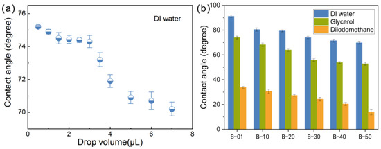 (a) Effect of drop volume on the CA measurement. (b) CA measurement by employing DI water, diiodomethane, and glycerol as probe liquids.