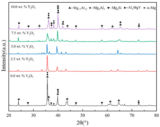 Figure 2 presents the XRD results of the laser cladding coatings with various Y2O3 contents. As shown, the coatings containing Y2O3 mainly consist of Mg17Al12, Mg2Al3, Mg2Si, Al4MgY, and α-Mg, while the Al4MgY phase is absent in coatings without Y2O3 addition. The original phases in the AZ91HP Mg alloy are Mg17Al12 and α-Mg. Due to the effect of the high-energy laser beam, the Mg alloy fully reacts with the coating material to produce a variety of intermetallic compounds as well as Al4MgY rare earth compounds. The diffraction peaks of the coating are concentrated between 35° and 40° with the high peaks being all Mg-containing phases, indicating that Mg diffuses into the coating through the melt pool and reacts fully with the coating elements to produce a variety of phase structures. Furthermore, the addition of Y2O3 resulted in a significant alteration in the phase diffraction intensity of the coating, as shown by the fact that a high peak at 36° appears in the coating without Y2O3, while a trend of decreasing and then increasing a peak at 36° occurs with increasing Y2O3 content. Similarly, a peak of 39° occurs in the coating without Y2O3, while the peak shows an increasing trend as the Y2O3 content increases from 2.5 to 10.0 wt.%.