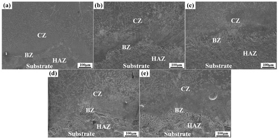 Figure 3 illustrates the cross-sectional microstructure of the coating with various Y2O3 contents. The coating consists of four parts, from top to bottom: the cladding zone (CZ), the bonding zone (BZ), the heat-affected zone (HAZ), and the substrate. The strip between the coating and the substrate is wavy. The reason for this is that the different melting points of the native α-Mg in the Mg alloy and the dissociated eutectic tissue at the grain boundaries, leads to a different amount of melting at different locations on the surface of the substrate. Thus, the surface of the substrate appears as a local melting depression area, which makes the solidified substrate and coating bonding interface wavy. This further confirms that the coating shows a good metallurgical bond with the substrate.