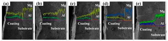 Figure 4 shows the results of the line scan of the coating cross-sections with various Y2O3 contents. Using the internal direction of the coating as the positive horizontal axis and the elemental content as the vertical axis, it can be seen that the elemental content of Mg gradually increases and rises steeply at the interface between the substrate and the coating, reaching a maximum in the substrate, while the elemental content of Al shows a decreasing trend, reaching a minimum in the substrate. The most abundant element in the coating is Mg, which reveals that the substrate surface layer melts instantly under the action of the laser to form a molten pool. It is conducive to a good bond between the coating material and the substrate, but this also results in the problem of an excessive dilution rate. From Figure 4a–d, the Mg element content in the coating gradually decreases as the Y2O3 content increases until the Y2O3 content is 7.5 wt.%, at which point the minimum amount of elemental Mg is reached and the lowest dilution rate is achieved. This is because Y2O3 has a very high melting point. Incorporating it into the coating increases the latent heat of melting the alloy powder, lowers the liquid phase temperature in the melt pool, raises the solid phase temperature, and reduces the time for solidification, which allows less time for the elements to diffuse [32,33]. This allows more of the coating elements to remain in the melt pool and inhibits the massive influx of Mg elements into the coating, thus enhancing the surface properties. In addition, the high melting point Y2O3 does not melt rapidly at the first stage of melt pool formation; instead, it is dispersed in different parts of the melt pool to absorb energy, slowing down the increase in melt pool temperature, reducing the movement of Mg atoms, and slowing down element diffusion. As the Y2O3 content continues to increase, the Mg element content in the coating begins to rise, as shown in Figure 4e, indicating that the addition of excessive Y2O3 will increase the dilution rate of the coating. This is attributed to the presence of the higher melting point Y2O3 in the melt pool over a large area, which impedes the convection between the Mg alloy and the Al-Si alloy in the molten state and reduces the convective heat exchange efficiency in the melt pool. This prolongs the existence of the melt pool and increases the opportunity for chemical element diffusion, which allows a large number of Mg atoms to enter the coating and the dilution rate to rise. The Mg content of the coatings with Y2O3 is lower than that of the coatings without Y2O3, which means that the addition of Y2O3 in the right amount can reduce the dilution rate of the coatings.