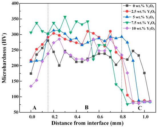 Hardness of coatings with various Y2O3 contents: A: the surface of the melt layer; B: the melt zone; C: the heat-affected zone.