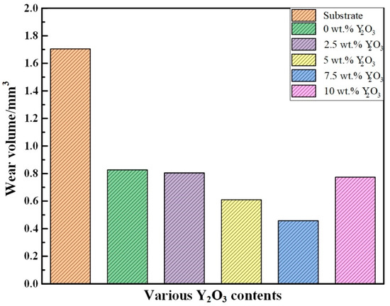 The wear volume of the coating with various Y2O3 contents is presented in Figure 9. As shown, the wear volume of the coating is significantly lower than that of the substrate. The presence of the hard phase in the coating changes the contact between the coating and the grinding ball, decreasing the contact area and reducing the tendency to adhere. The coating microstructure is significantly refined, which strengthens the coating properties and increases the hardness and wear resistance of the coating. The wear resistance was further improved by the addition of Y2O3 to the coating. As the Y2O3 content increases, the wear volume of the coating first decreases and then increases, but both are smaller than the wear volume of the substrate. The minimum value (0.4584 mm3) is reached when the Y2O3 content is 7.5 wt.%, which is only 26.68% of the wear volume of the substrate. The addition of Y2O3 refines the grain size and makes the coating more evenly distributed, increasing the surface hardness and enhancing wear resistance. With the continued increase in Y2O3 content, however, the wear volume of the coating with a Y2O3 content of 10 wt.% increases compared to the wear volume of the coating at 7 wt.%. Excess Y2O3 reduces the fluidity of the melt pool, hinders the heat dissipation of the melt pool, and decreases the degree of subcooling, resulting in larger grains and an uneven microstructure distribution. This microstructure presents lower surface coating hardness and poorer wear resistance.