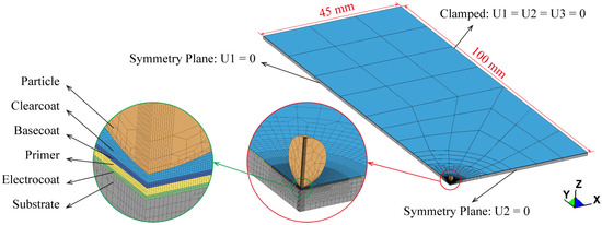 The simulation configuration of impact failure of automotive coatings is shown in Figure 2. The model is composed of a substrate, a multi-layered coating, and a particle. It should be emphasized that the multi-layered coating contains four paint films, i.e., the clearcoat, basecoat, primer, and electrocoat. Additionally, the dimensions of each part are consistent with those in the experiment. The particle has an initial velocity of 91.2 m/s, and the physical time of this simulation is selected as 40 μs to ensure that the whole failure process of the coating can be captured. Thanks to symmetric conditions, one quarter of the model is taken for discretization with fully integrated 8-node hexahedron solid elements. Since the experimental results show that no interlaminar failure occurs at the interfaces between the paint films, these interfaces are simulated by sharing nodes. To minimize the computational cost without compromising the accuracy of the simulation, mesh transitions are adopted, and the coating in the vicinity of the impact location is discretized with a finer mesh with a minimum in-plane element dimension of 10 μm, which is determined by a mesh convergence analysis introduced in Section 3. It is worth noting that the employed LDCZM allows using non-matching meshes at the interface, and the substrate is not the interested component. Therefore, the coarser meshes are used to discretize the substrate for better computational efficiency. As for the boundary conditions, the translational degrees of freedom of nodes on two symmetry planes are restricted in the x-direction (U1 = 0) and y-direction (U2 = 0), respectively, and the nodes of the clamped area outside the model are subjected to fixed constraints (U1 = U2 = U3 = 0). In addition, a contact algorithm based on the element-based mortar algorithm is used to calculate the contact force between the particle and coating, and the friction coefficient is set to 0.3 [53]. In this model, the element numbers of the particle, coating, and substrate are 2088, 60,288, and 10,350.