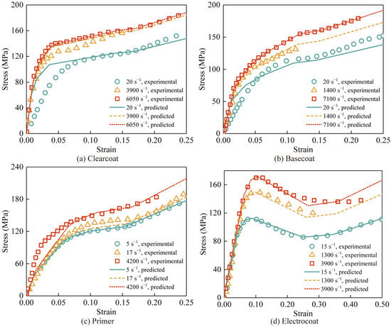 Comparison between experiment data [57,58] and predicted stress–strain curves of four paint films, i.e., (a) clearcoat, (b) basecoat, (c) primer, and (d) electrocoat, at different strain rates.