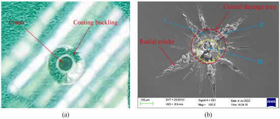 Figure 4 shows the results of the single-impact experiment on automotive coatings. As can be seen in Figure 4a, there exists a crater centered on the impact point. In addition, coating buckling is found at the edge of the crater, which indicates the occurrence of delamination. It is measured that the radius of the delamination area is about 1.43 mm. The failure patterns of coating observed using SEM are presented in Figure 4b. Material removal can be observed at a circular damaged region (marked with a red dotted circle) near the impact point, which results in the exposures of two bottom layers, with one within the smaller yellow dotted circle and the other located between both circles. What is more, there are multiple radial cracks that are distributed on the periphery of the central damaged region.