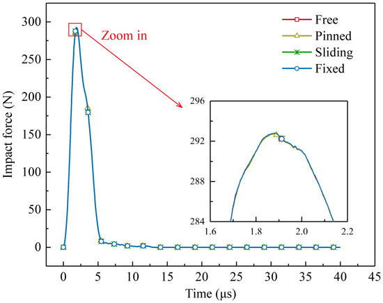 Due to the complex clamping conditions in the experiment, a fixed constraint boundary condition is adopted in the simulation model for simplification. To determine the influence of boundary conditions on the simulation results, various boundary conditions on the long edge of the sample are also taken into consideration with the final mesh, i.e., free, pinned, sliding, and fixed, as shown in Figure 6. Except for the investigated conditions, parameters remain the same as those presented in Section 2. The predicted outcomes of these four boundary conditions are given in Figure 7 and Table 8. As can be observed, the impact force histories are indistinguishable from each other. On the other hand, compared to the fixed condition, the others produce a maximum relative error of around 1.34% in terms of delamination area radius. Hence, when the in-plane size of the specimen is large enough, the boundary condition has little effect on the impact response of automotive coatings due to damage localization.