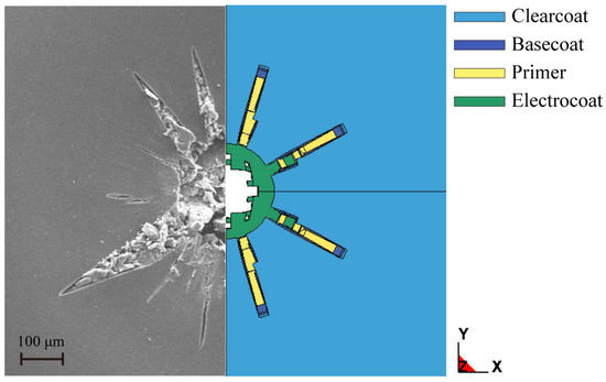 In consideration of experimental methods being of poor repeatability and high cost, numerical methods have become an attractive tool for investigating the impact problem. Many studies regarding the multi-particle impact test have been conducted [12,13,14,15]. With regard to the single-impact test, Toi et al. [16,17] established an elasto-viscoplastic-damage constitutive model and evaluated the impact resistance of automotive coatings in combination with a non-coupled analysis method. The mechanisms of impact energy absorption of a polymer coating had been numerically analyzed by Grujicic et al. [18]. Based on the stress field of the coating, Zhang et al. [19] investigated the spalling mechanism of polymer coating material under collision conditions. Furthermore, Xu et al. [20] carried out a debonding analysis of an organic coating–substrate structure under single impact with the help of a GPU parallel computational framework. In addition, the effect of coating thickness on the impact failure was analyzed as well, where the polymer-ply failure of the coating was simulated using the element deletion method [21]. To avoid the problem of mesh distortion and tangling existing in the traditional finite element method, Gong Yi et al. [22] utilized a coupled finite element and meshfree method to investigate the impact issue on a ductile metal pipe with a polymer coating. More relevant research can be found in [23,24,25,26,27,28]. However, the above studies cannot simultaneously reproduce the polymer-ply and interlaminar failures of the coating, which is not conducive to clarifying the impact failure mechanism of the polymer coating. In light of this, Zou et al. [29] proposed a computational framework for impact damage of polymer coatings, which accounts for both polymer-ply and interlaminar failures of the coating, and this method is verified by a single-impact simulation of a single-layered polymer coating. In summary, most existing numerical studies on the impact failure behavior are for single-layered polymer coatings. As for multi-layered polymer coatings, i.e., automotive coatings, there is still a lack of an effective finite element model to simulate the impact event.