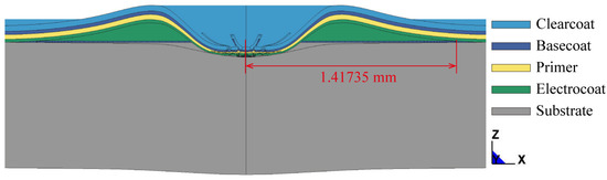It is reported that primer plays an important role in the impact resistance of automotive coatings [37,38], and studies in this respect have been carried out. Through single-impact tests, Lonyuk et al. [39] revealed that a low glass transition temperature of the primer contributes to the better impact resistance of automotive coating systems. Another experimental study suggests that the crosslinker content of primer can also significantly affect the anti-impact performance of automotive coatings [40]. However, to the best of the authors’ knowledge, the role of primer in the impact resistance of automotive coatings still lacks effective computational verifications.