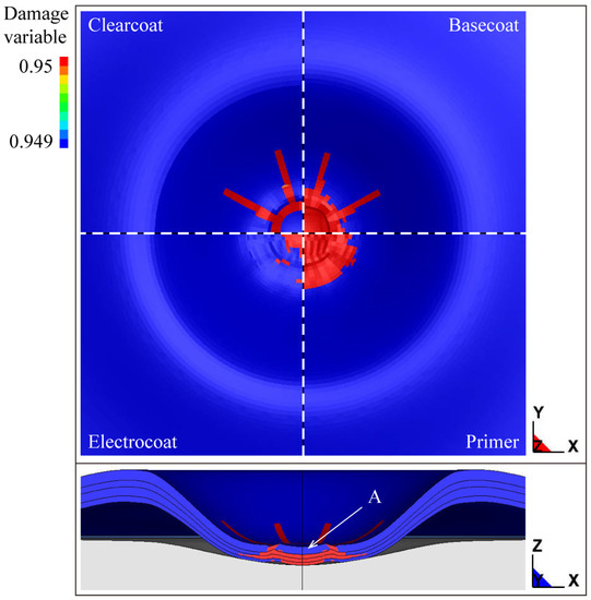 To have a more intuitive understanding of the in-ply failures, the predicted polymer-ply failure patterns of four paint films are displayed in Figure 10. It is worth noting that the range of legend values for the contour plot is set as 0.949–0.95 without interpolation of the damage variable, so the elements in red are considered to be completely failed. As can be seen, a circumferential crack and radial cracks can be found in the clearcoat. Both the central damage and radial cracks are observed in the basecoat. For the two bottom paint films, only central damage occurs. It is interesting that although elements in region A have not been fully damaged, a circumferential crack has gone around this region. So, it is believed that the coating material in this region is removed from the sample in the form of a fragment.