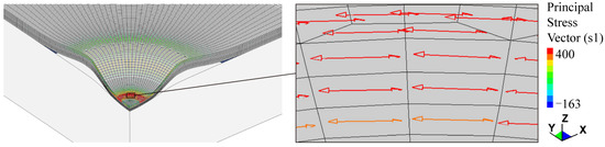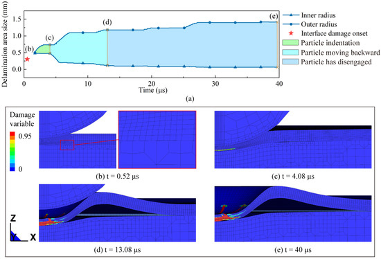 Figure 11 and Figure 12, respectively, present the evolutions of polymer-ply and interlaminar failures of the coating. As can be seen at the moment of 0 μs, the particle impacts the coating and moves downward. As the particle squeezes the coating, at 0.52 μs, a significant relative tangential displacement is observed at the coating–substrate interface, which suggests that the onset of interlaminar failure is caused by interface shear stress. Then, damage initiation occurs in the primer at about 1.24 μs. At this moment, as demonstrated in Figure 13a, the negative maximum principal stresses distributed in this region do not meet the failure criterion of brittle damage, whereas the effective plastic strain in this area is high enough and has exceeded the corresponding critical value. Hence, a ductile failure of the primer is triggered. Later, as the particle continues to extrude, the damaged area rapidly propagates along the radial and thickness directions.