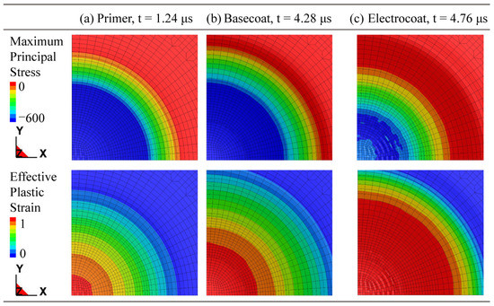It needs to be declared that since each paint film is of micron thickness and the strain rate is extremely high (about 106 s−1), it is difficult to obtain reliable damage parameters through experimental methods. According to the authors’ review of the literature, there are no reliable damage parameters for reference in the published literature. In light of this, in this model, the damage parameters are adjusted by comparing the simulation phenomenon with the experimental one. In the future, the development of a reliable parameter identification method is an essential step to make it a model of higher fidelity.