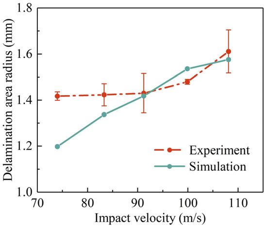 Experimental and predicted delamination area radius with different impact velocities.