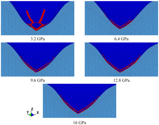 In this section, with the help of the finite element model built in Section 2, the influences of primer mechanical properties on the impact resistance of automotive coatings are investigated, and the primer mechanical properties include Young’s modulus and yield behavior. It needs to be emphasized that in this section, except for the parameters studied, the others are consistent with those in Section 2. Since the single impact does not lead to a large, damaged area of the coating, only a local region centered on the impact point is displayed in the following figures. What is more, the range of legend values for the contour plot is set as 0.949–0.95 without interpolation of the damage variable, so the elements in red are considered to be completely failed. Last but not least, in our work, the interlaminar failure area size is employed to quantitatively evaluate the impact resistance of automotive coatings.