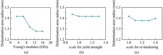 Dependence of the delamination area size on primer mechanical properties. (a) Young’s modulus, (b) yield strength, and (c) re-hardening modulus.