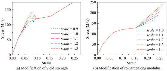 Stress–strain curve of primer at 5 s−1. (a) Modification of yield strength. scale is the ratio of modified yield strength to its initial value. (b) Modification of re-hardening modulus. scale is the scale factor of the 6th value of yield stress in Table 4.