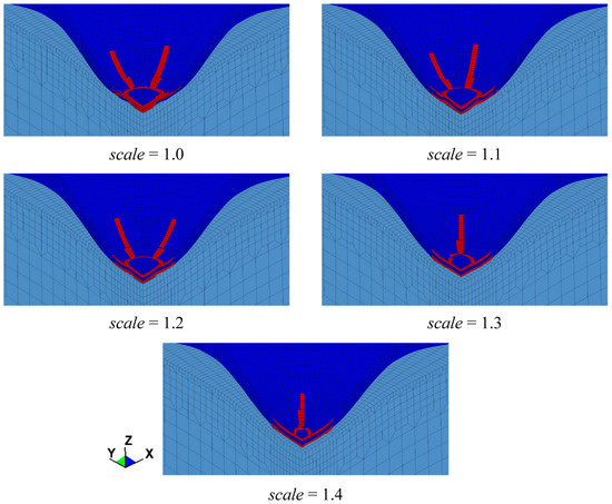 In this sub-subsection, we studied the effect of the yield behavior of the primer on the impact resistance of automotive coatings, focusing on the yield strength and re-hardening modulus. Considering that a piecewise-linear-plastic model is employed to characterize the mechanical behavior of the coating in our work, manipulation of data of the primer listed in Table 4 is needed. With reference to the method of Zou [36], the third value of is considered as the yield strength, which is scaled by a parameter scale, and linear interpolation is performed to obtain the modified one of the second yield stress data. Except for these two values, the others are kept constant. As for the modification of the re-hardening modulus of the primer, the sixth value of is scaled by the parameter scale, and the other data remain unchanged. The modified curves are plotted in Figure 18.