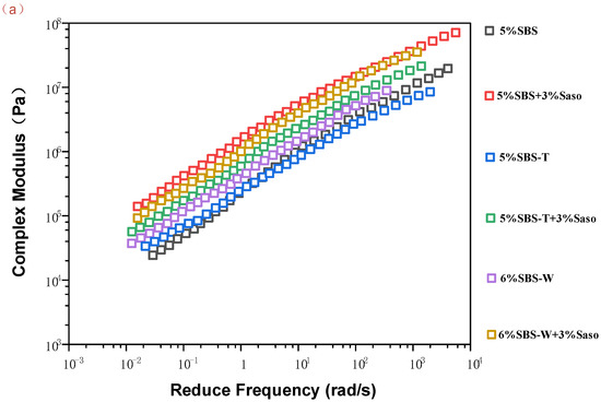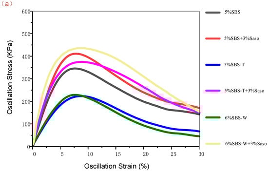 The curves in the figure show that the peak stress and peak width of polymer-modified asphalt after adding Sasobit are significantly increased, which indicates that Sasobit can improve the stiffness and deformation resistance of asphalt binder. Figure 6b,c both show that the strength of UV- or PAV-SBS MA is lower than that of SBS-T or SBS-W modifiers. These results indicate that compared with SBSMA, the speed-melting SBS-modified asphalt has better strength after aging, that is, better fatigue resistance.
