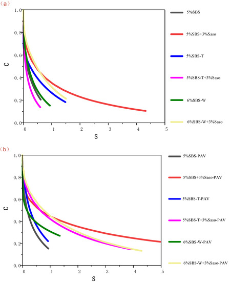 It can be clearly seen from Figure 7 that with the progress of the experiment, the asphalt binder gradually develops from the undamaged state of C = 1 to the damaged state, and the value of C gradually decreases while the value of S gradually increases. This change can quantify the damage evolution process of the material. The shape of the DCC curve of asphalt binder before and after adding Sasobit is different, indicating that Sasobit changes the injure evolution process of asphalt. As can be seen from Figure 7a, the DCC curves of the three types of modified asphalt with Sasobit are all above the three types of polymer modified asphalt, indicating that at the same damage degree, the integrity of the warm mixed polymer modified asphalt is better and the ability to resist deformation is stronger. When fatigue failure is reached, the values of the virtual modulus Cf and damage variable Sf of each material are different. Compared with the three polymer-modified asphalt cement, the Sasobit-added asphalt binder has a smaller Cf value and a larger Sf value. Since the virtual modulus C represents the integrity of the material and the damage variable S represents the damage degree of the material, this situation indicates that the material with Sasobit has a larger damage degree when it reaches fatigue failure, and the material has a strong anti-fatigue ability.