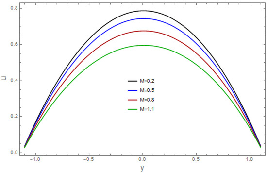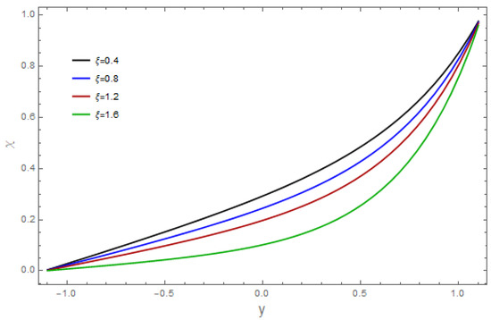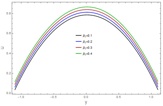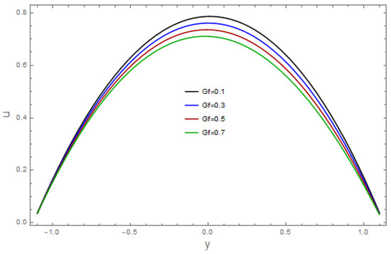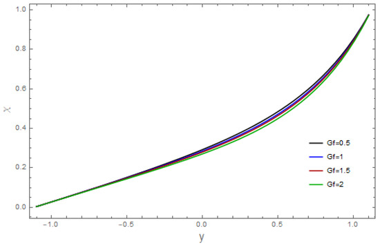 The consequences of the relevant parameters for velocity are presented in Figure 1, Figure 2, Figure 3, Figure 4, Figure 5, Figure 6, Figure 7 and Figure 8. The effect of the velocity slip parameter, , is depicted in Figure 1. It was noticed that the velocity of the fluid arises via the velocity slip parameter Figure 2 demonstrates the aspects of the Grashof number, against velocity. An enhancement in temperature is observed against the Grashof number . The sketch of the bioconvection Rayleigh variable, is illustrated in Figure 3. As we can see, the velocity of the fluid declines with a larger The features of the buoyancy ratio variable, on the velocity profile are shown in Figure 4. The graph represents how the boosts fluid velocity. The impacts of the Hartman number, on the velocity are revealed in Figure 5. This graph makes it clear that the liquid’s velocity is decreasing. The implications of the bioconvection Peclet number on the velocity profile can be seen in Figure 6. The observed outcomes show that a rise in increases the velocity. The impact of the Weissenberg number, is portrayed against velocity (see Figure 7). In this figure, we can see that the velocity of the liquid increases. The wall parameters and are exhibited in Figure 8. It was detected that velocity is an increasing function of and and it decreases for in view of the damping effect.