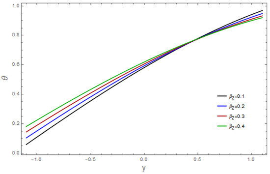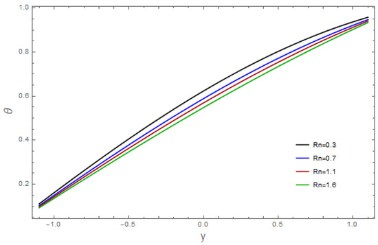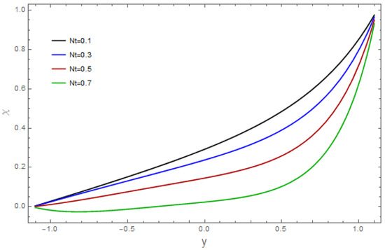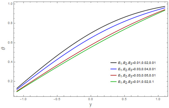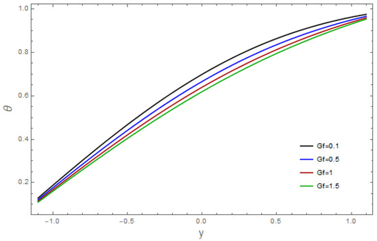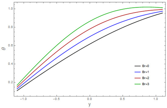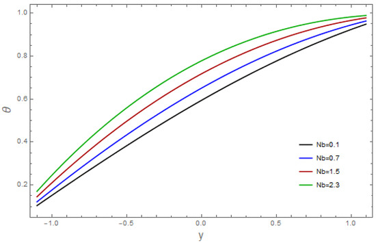 The influence of various pertinent parameters on temperature is captured through Figure 9, Figure 10, Figure 11, Figure 12, Figure 13, Figure 14, Figure 15, Figure 16 and Figure 17. Figure 9 represents the outcomes of the bioconvection Rayleigh parameter, with temperature. The temperature of the fluid declines as the bioconvection Rayleigh variable, increases. The influence of the Grashof number, on temperature is displayed in Figure 10. As we can see, increasing the values of causes the material’s temperature to increase. Figure 11 depicts the thermal field against the Brownian movement variables With increasing Brownian diffusion, , the average kinetic energy of the fluid increases. As a result, the temperature acclivities. Figure 12 depicts the effect of the thermal radiation parameter on the temperature. This graph demonstrates that the temperature declines when the radiation variable, Increases. Figure 13 portrays the impressions of the Brinkman variable, on the temperature. As a high Brinkman variable, intensifies, the outcomes of the viscous dissipation results in temperature acclivities. The impact of the thermal slip parameter, is shown via Figure 14. By enhancing the values of the thermal slip parameter, we can see that temperature increases. The effects of the buoyancy ratio variable, are displayed in Figure 15. An increasing trend is noticed for temperature vs. the buoyancy ratio variable The thermal field vs. the Weissenberg number, is shown in Figure 16. The temperature decreases as the mass Weissenberg number, increases. The consequences of the wall parameters , and are presented in Figure 17 for temperature. It is shown that temperature is an increasing function of and and it decreases with in view of the damping outcome.