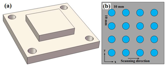 The μ-X360n (Pulstec, Hamamatsu, Japan) residual stress measuring instrument was employed to measure residual stress. To reduce the influence of rough surface, the electrolytic polishing instrument was used to polish the test part before the measurement. The sample with size of 50 × 50 × 10 mm was printed to evaluate the residual stress, and the distribution of test points is shown in Figure 2b. The microstructure of SLM is mainly martensite, and its lattice structure is BCC. Therefore, BCC module in u-360 equipment is used for residual stress measurement. Single direction stress measurement can be completed by single angle secondary incidence. The residual stress in X/Y direction (σx, σy) needs to be rotated 90° for testing. In addition, the positive value is tensile stress and the negative value is compressive stress. The average residual stress is the mean value of normal distribution statistics.