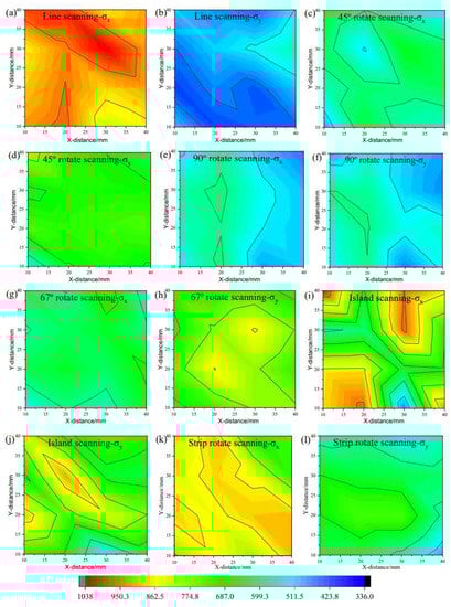 The results of residual stress distribution with different scanning strategies are displayed in Figure 4. As can be seen from Figure 4a,b, the residual stress in the X-Y direction has directionality adopting in line scanning and accumulates along the scanning direction, and the maximum peak stress can reach 1038 MPa. However, the stress perpendicular to the scanning direction is small, and the average stress is about 450 MPa. The stress distribution can be changed using different angles of interlayer rotation scanning strategy. As shown in Figure 4c,d, the stress distribution in the X and Y directions can be more uniform by 45° rotate scanning. Due to the direction of the temperature, gradient distribution was changed using the interlayer rotation scanning strategy to obtain a more uniform temperature distribution, thus reducing the concentration distribution of stress. When the interlayer 90° rotation scanning strategy was adopted, the stresses in the X and Y directions are relatively small, and the residual stress distribution is between 500 and 600 MPa, as shown in Figure 4e,f. Moreover, the finite element simulation results of stress under different scanning strategies show that the minimum residual stress can be obtained using the 45° rotation scanning strategy [25]. Furthermore, Figure 4g,h shows that the residual stress obtained by 67° rotation scanning between layers is small, and the stress distribution in both directions is relatively uniform, with an average stress of about 700 MPa. Uniform rotation between layers could reduce the cumulative superposition of residual stress in the scanning line direction, and uniform rotation scanning is more conducive to the uniform distribution of residual stress in multi-layer forming. The residual stress distribution of the island scanning strategy is between 700 and 950 MPa, as shown in Figure 4i,j, but there is local stress concentration. The island scanning strategy could reduce the distribution of residual stress to a certain extent, but splicing areas were present in the connection area of each partition, which would form a certain stress accumulation after heat treatment by the laser for many times. For the forming of large-sized components, the jump of laser took a certain amount of time, and the overall forming time of island scanning would increase and affect the forming efficiency. The residual stress distribution obtained by the strip rotation scanning strategy is between 600 and 850 MPa. Since the laser scanning direction is in the acute angle scanning range, the stress in the X direction is slightly larger than the Y direction. Due to the small strip spacing (10 mm), the temperature gradient in the local area can be controlled at a small level.