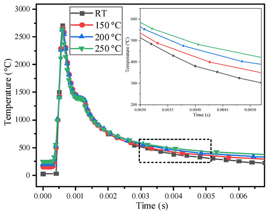 It can be concluded that higher preheating temperature is not always favorable for high-strength steel materials. With the increase in preheating temperature, the residual stress may increase. The thermal cycle curve of preheating is shown in Figure 6. In the SLM manufacturing process, the temperature of the monitoring point increases with the preheating temperature, but the maximum temperature of the molten pool slightly changes with the decrease in the laser power. As the preheating temperature increases, the cooling stage of the temperature cycle curve slows down; namely, the cooling speed of the formed block decreases. The cooling rate of molten pool decreases from 2.32 × 105 °C/s (without preheating) to 1.43 × 104 °C/s (preheating temperature 250 °C). More uniform cooling rate can be obtained by preheating the substrate, and the stress growth caused by the rapid cooling of the metal around the molten pool can be slowed down. The best stress control can be obtained at a preheating temperature of 200 °C. However, higher temperatures place higher demands on the equipment; therefore, a suitable preheating temperature should be 100–150 °C.