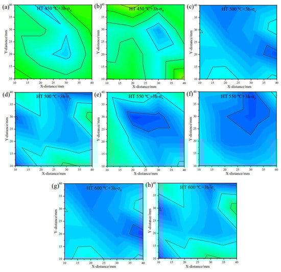 Residual stress distribution of SLM forming at different annealing temperatures. (a) σx-HT 450 °C; (b) σy-HT 450 °C; (c) σx-HT 500 °C; (d) σy-HT 500 °C; (e) σx-HT 550 °C; (f) σy-HT 550 °C; (g) σx-HT 600 °C; (h) σy-HT 600 °C.