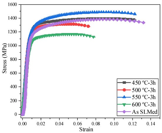 The effect of stress relief annealing treatment on the mechanical properties of 24CrNiMo steel was also investigated, which is shown in Figure 9. As the annealing temperature increases to 500 °C, the strength and elongation decrease. Due to the secondary hardening phenomenon at 500 °C and the precipitation of cementite in the non-equilibrium solidification microstructure, the toughness is significantly reduced. With the further increase in annealing temperature, the microstructure of SLM is transformed into tempered sorbite, which improves the strength and toughness. After annealing treatment at 550 °C for 3 h, the yield strength reaches 1214 MPa, the tensile strength reaches 1485 MPa, and the elongation after fracture is 12.5%. When the annealing temperature reaches 600 °C, the strength and elongation decrease greatly, which is due to the decomposition of martensite and residual austenite at this temperature, and the solution carbon in α-Fe tends to be stable, resulting in the reduction in solution strengthening. The precipitation and aggregation of cementite lead to the decrease in dispersion strengthening effect, eventually causing a significant reduction in strength and toughness. Therefore, the stress relief annealing temperature for SLM forming of 24CrNiMo steel is 550 °C. In addition, the time of annealing treatment would be selected according to the size and structural characteristics. In this study, the stress relief annealing time was 3 h. For large-sized structural components, the stress relief annealing time can be appropriately prolonged.