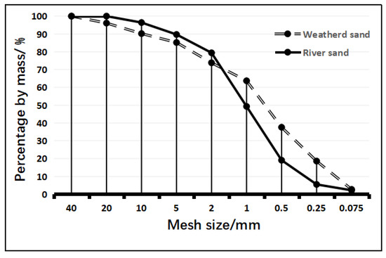 The test results of granular analysis of weathered sand and river sand are shown in Table 2, and the particle distribution curve is shown in Figure 1.