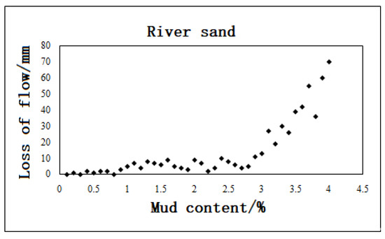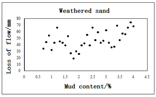 By selecting standard sand, qualified river sand, qualified weathered sand with known silt content, and river sand materials with high silt content, the fluidity test is conducted under the condition of a standard temperature of the laboratory 20 ± 2 °C and relative humidity > 50%. The test results are shown in Table 4. Several groups of repeated tests on fluidity loss of river sand and weathered sand under different mud content conditions are carried out, and the results are shown in Figure 5 and Figure 6: