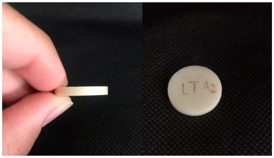 A total of 21 ceramic specimens were fabricated using CAD/CAM technology following the manufacturer’s instructions [15]. The specimens were in the form of flat cylindrical disks measuring 20 mm in diameter and 3 mm thick (Figure 1), and had a shade of A2. To standardize the dimensions of all the specimens, digitalized designing was carried out using 3D software 18.0.1931.0 (3D Builder, Microsoft Corporation, Washington, WA, USA) [15]. The specimens were divided into three groups according to their material (n = 7): IPS, lithium disilicate; LZr, classic zirconia coping with feldspathic layering; and TZr, novel extra-translucent zirconia (Table 1). All the specimens were glazed at temperatures recommended by the manufacturer. The details of the materials used in the study are listed in Table 1.