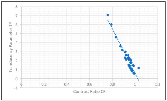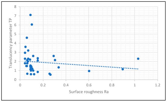 Spearman’s correlation between the differences in the pre- and post-values of the TP, CR, and Ra values in each of the three tested materials revealed a strong negative correlation between the translucency parameter and contrast ratio in all specimens tested (r = −0.92). That is, when the TP decreases, the CR increases (Figure 7). A similar pattern was observed between the surface roughness and the translucency parameter (Figure 8). However, this negative correlation (r = −0.75) between Ra and TP values was mainly statistically significant in the LZr group.