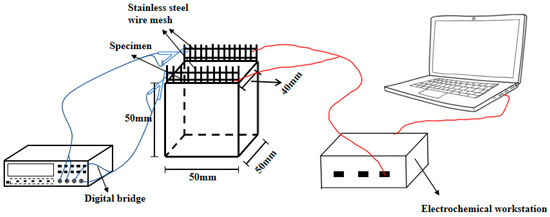 TH2810D LCR digital electric bridge with a testing standard frequency of 100 Hz, 120 Hz, 1 kHz, and 10 kHz provided by Changzhou Tonghui Factory is used for measuring AC Re. Additionally testing voltage and frequency of TH2810D are 1 V and 10 kHz, respectively. The specific connection and method refer to Wang’s article [34]. For the reason that the AC Re measurement of concrete can minimize Re instability caused by polarization, in this study, so the two electrodes are applied in the measurement of Re.