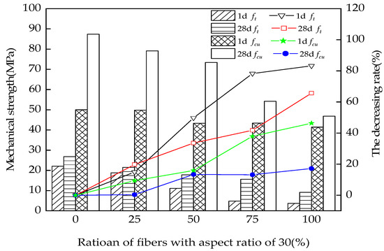 Figure 4 shows fcu and ft of specimens with different steel fiber content with AR-30. It can be found that the mechanical performance decreases with the increase of steel fibers with AR-30 (The maximum rate of decline is 80%). Meanwhile, the decline in fcu with the curing age of 28 d is more obvious than fcu with the curing age of 1 d. However, the decline in ft with the curing age of 28 d is lower than ft with the curing age of 1 d. The dramatic declines in fcu with the curing age of 28 d and ft with the curing age of 1 d are observed with the ratio of the steel fibers with AR-30 from 50% to 75%. When the total amount of fibers remains unchanged, the increase of steel fibers content with AR-30 will reduce the number of fibers. Thus affecting the bridging effect of fibers in RPC. In addition, steel fibers with AR-30 tend to sink to the bottom, resulting in uneven dispersion of fibers [35]. The degree of hydration of the specimen is low after curing for 1 day, and ft is mainly provided by steel fibers. Therefore, ft decreases with the increase of steel fibers content with AR-30.