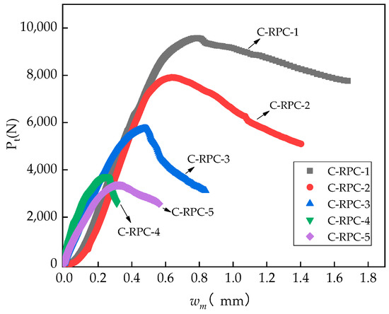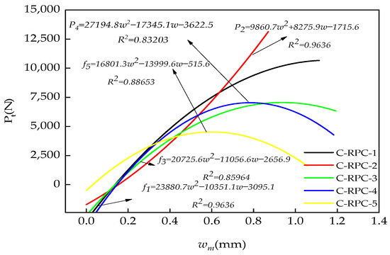 Figure 5 and Figure 6 show the flexural stress (Pt) and mid-span deflection (wm) of specimens. It can be found from Figure 5 and Figure 6, wm decreases with the ratio of steel fibers with AR-30 from 0% to 100%. At the same time, the maximum Pt decreases. Figure 7 and Figure 8 show the fitting curves of Pt, wm, and the fitting results of Pt and wm curves. The curves of Pt and wm with the curing age of 1 d extremely fit a quadratic parabola. α in Figure 9 is calculated. It can be found from Figure 9, α decreases with the increase of steel fibers with AR-30. Meanwhile, a dramatic decrease in α is observed with the ratio of steel fibers with AR-30 from 0% to 25%. However, the decreasing rate decreases with the increase of steel fibers with AR-30, which can be attributed to the fact that the decrease of α will slow down when the ratio of steel fibers with AR-30 reaches a value. Furthermore, the number of steel fibers with AR-75 will be more at the same ratio, which is more uniformly distributed in the RPC. The fibers are more tightly embedded in the concrete, resulting in improving α of RPC [36]. Additionally, ft with a curing age of 28 d is higher than ft with a curing age of 1 d, indicating the accuracy of experimental data.