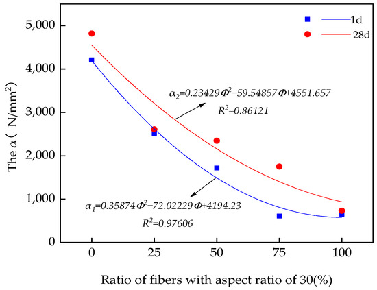 The addition of steel fibers with an aspect ratio of 30 can weaken α of RPC. The decreasing rates with the curing age of 1 d and 28 d are 85.48% and 84.77%, respectively.