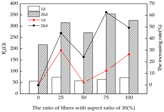 Figure 10 shows Re, the increasing rate, and the ratio of steel fibers with AR-30. The steel fibers with AR-30 induce the ascending in Re. However, the increase of R seems to be irregular. Re of specimens with the curing age of 1 d and 28 d are measured reaching the maximum value at 25% and 75%, respectively. The increase of steel fibers with AR-30 will reduce the tightness of the electric grid composed of fibers in RPC. However, the gaps increase with the increase of steel fibers with AR-30. The free ions in the specimens produce electrophoresis during electrification, and the electrophoresis phenomenon leads to the enhancement of the electric conductivity of the specimens, leading to the instability of Re.