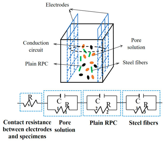 Figure 13 shows the circuit schematic and equivalent circuit diagram of electrochemical impedance spectroscopy. It can be seen that the electric circuit diagram of RPC with compound cement accord with the series conduction model. Re and capacitance include steel fibers, plain RPC, and pore solution, and these three parts respectively connect with contact resistances of the electrode and specimens [39]. The Chi-squared is less than 2.324 × 10−3, indicating that the equivalent circuit is reasonable.