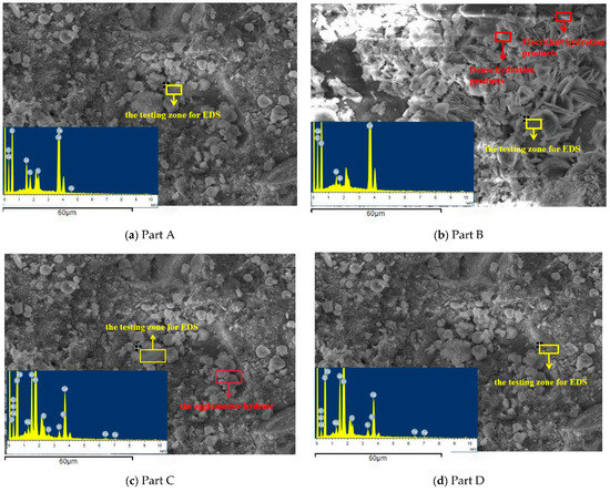 After the samples are cured, the samples are soaked in absolute ethanol for 5 days to prevent cement hydration. YZF-6050 vacuum drying oven with an output power of 1200 W (Shanghai yaoshi Co., Ltd., Shanghai, China) is used to dry the samples at 105 °C for 2 days. Then, the bean-sized and pebble-free particles are removed from the oven-dried samples. The collected particles are pasted on the aluminum plate with conductive tape. The particle surfaces are sputtered with a layer of gold film in a vacuum environment. The prepared samples are used for measuring SEM and EDS. The analysis method of the hydration products analyzed by results of SEM and EDS is based on Wang’s article [9].