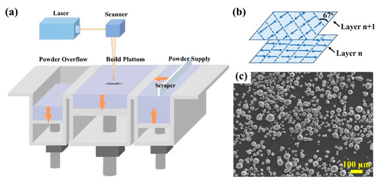 (a) Schematic diagram of SLM; (b) scanning strategy; (c) powder morphology.