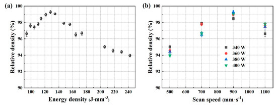 Figure 2a describes the densification of samples with different process parameters, indicating that the relative density of the sample increases first and then decreases as the volume energy density increases. The densest part (99.3%) was obtained when the EDv was 127.95 J·mm−3. In Figure 2b, when the laser power exceeds 380 W, a low scanning speed reduces the relative density of the samples. For the same laser power, the sample fabricated at the scanning speed of 900 mm·s−1 had the highest relative density.