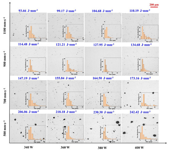 Metallographic images and the size distribution of pores of as-built samples with different process parameters are shown in Figure 3. No cracks were found in those parts, so the objective of parameter optimization for SLM Al is minimizing porosity in the fabricated parts. When the lower values of scanning speed (500 mm·s−1) are applied, some spherical pores of tens of microns appear, indicating the “keyhole mode” laser melting. There are also small pores of less than 10 microns, and their formation is attributed to entrapped shielding gas or the evaporation of elements [25]. As the scanning speed increases to 1100 mm·s−1, the porosity of the sample increases. This is related to the non-molten powder and the undamaged oxide film outside the semi-solid melt, which are difficult to be remelted by the molten pool of subsequent layers due to the low laser EDv [26]. The specimen with minimal porosity is obtained as P is 380 W and v is 900 mm·s−1, which are used as the optimal parameters to process samples in the following research.