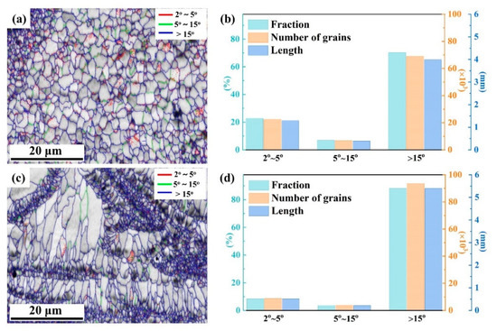 Grain boundary maps of Figure 5a,d are exhibited in Figure 6a,c, respectively, and the corresponding quantitative analysis results are presented in Figure 6b,d. The total length of the grain boundary is 5.67 mm for the XY plane, 6.13 mm for the XZ plane, and the number of grains is 98,249 for the XY plane and 106,106 for X, so the total length of the grain boundary and the number of grains per unit area shows little difference on different planes. In addition, it can be observed that the fraction of low-angle grain boundaries (LAGBs) (2° ≤ θ ≤ 15°) on the XY plane (29.7%) is higher than that on the XZ plane (11.8%).
